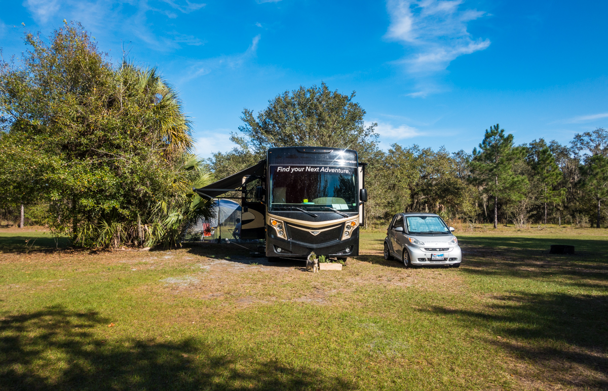 As we mentioned in the video this type of FL camping is NOT for everyone! It can be unbearably hot and humid one day followed by nearly freezing temps and rain the next. These locations are often down long dirt roads, and when it rains your coach gets very dirty (check out our RV in the Hickory Hammock photos). There’s bugs, spiders, mice, venomous snakes and a host of other things lurking out your door (which we love finding) that can creep some people out and can harm you and your pets if you don’t keep your eye out for them. So if you’re not into glorified tent camping with your RV we wouldn’t suggest wild camping in FL (or most wild camping). But that’s why we love it…it’s not for everyone so its a little more peaceful 🙂